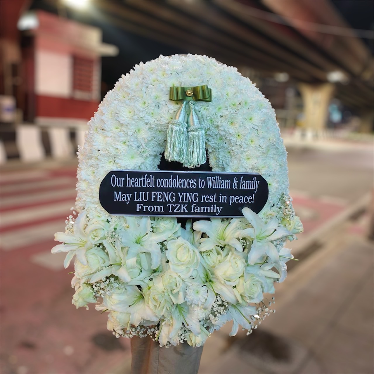 หมวดหมู่สินค้า : พวงหรีดดอกไม้สดร้านพวงหรีด จัดส่งพวงหรีดได้ทุกวัด พวงหรีดดอกไม้สด จัดด้วยดอกไม้คัดเกรดคุณภาพ สีขาวม่วง สื่อความอาลัยอย่างลึกซึ้ง เหมาะสำหรับแสดงความเสียใจในพิธีศพ