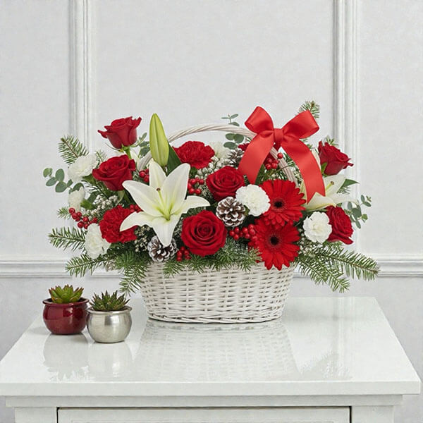 ภาชนะ: กระเช้าหวายสีขาวสานประณีต พร้อมริบบิ้นซาตินสีแดงหรูหรา